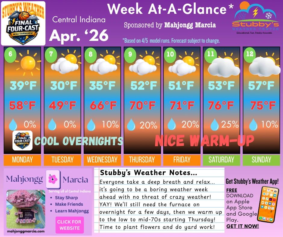 Pretty calm week ahead... but a cool start then finishing strong in the 70s. This Week-At-A-Glance Forecast sponsored by Mahjongg Marcia.